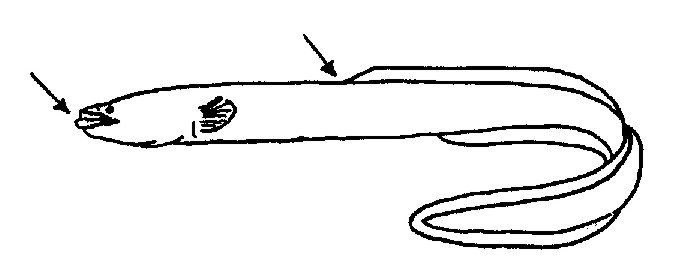 Mycket långsmal "ålformad" (!) kropp. Små fjäll djupt nedsänkta i huden.