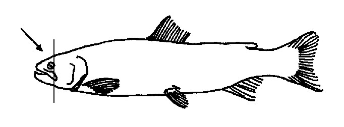 Mungipan går längre in än ögat (hos laxen sitter de i linje).